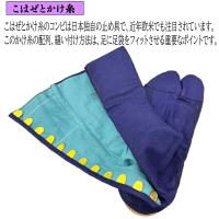 こはぜとかけ糸のコンビは日本独自の止め具で、近年欧米でも注目されています。このかけ糸の配列、縫い付け方法は、足に足袋をフィットさせる重要なポイントです。