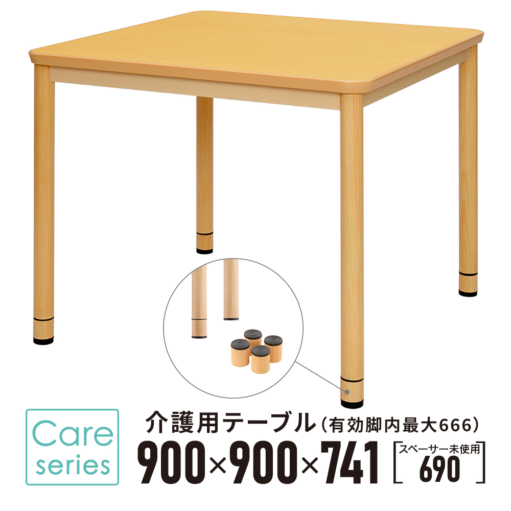 | サイズ | ●W900×D900×H741mm(スペーサー未使用690mm) ●テーブル幕板下内寸:H666mm(スペーサー未使用615) ●脚間内寸:W764mm |
