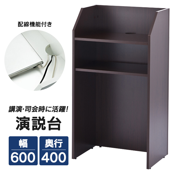 | 特徴 | 講演や演説、司会やプレゼンテーション時に活躍する演説台。天板にはPCやマイク等の設置用に配線穴が開いています。天板下には棚板があり、資料や手荷物等が収納できます。プリント・強化紙樹脂化粧板ではありません。消毒・水拭きOK! |