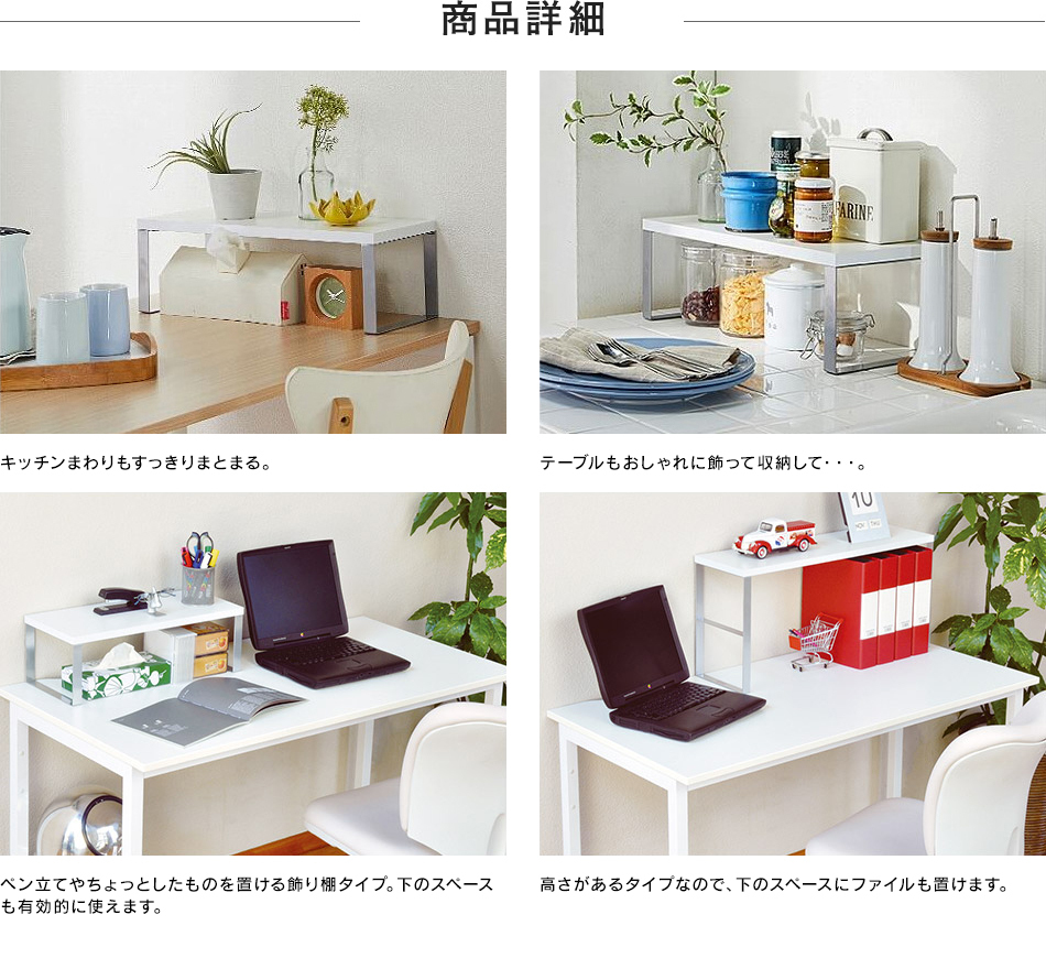 飾り棚としても使えるシンプルな小型の机上ラック。下のスペースには資料を置いたりと有効活用できます。