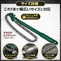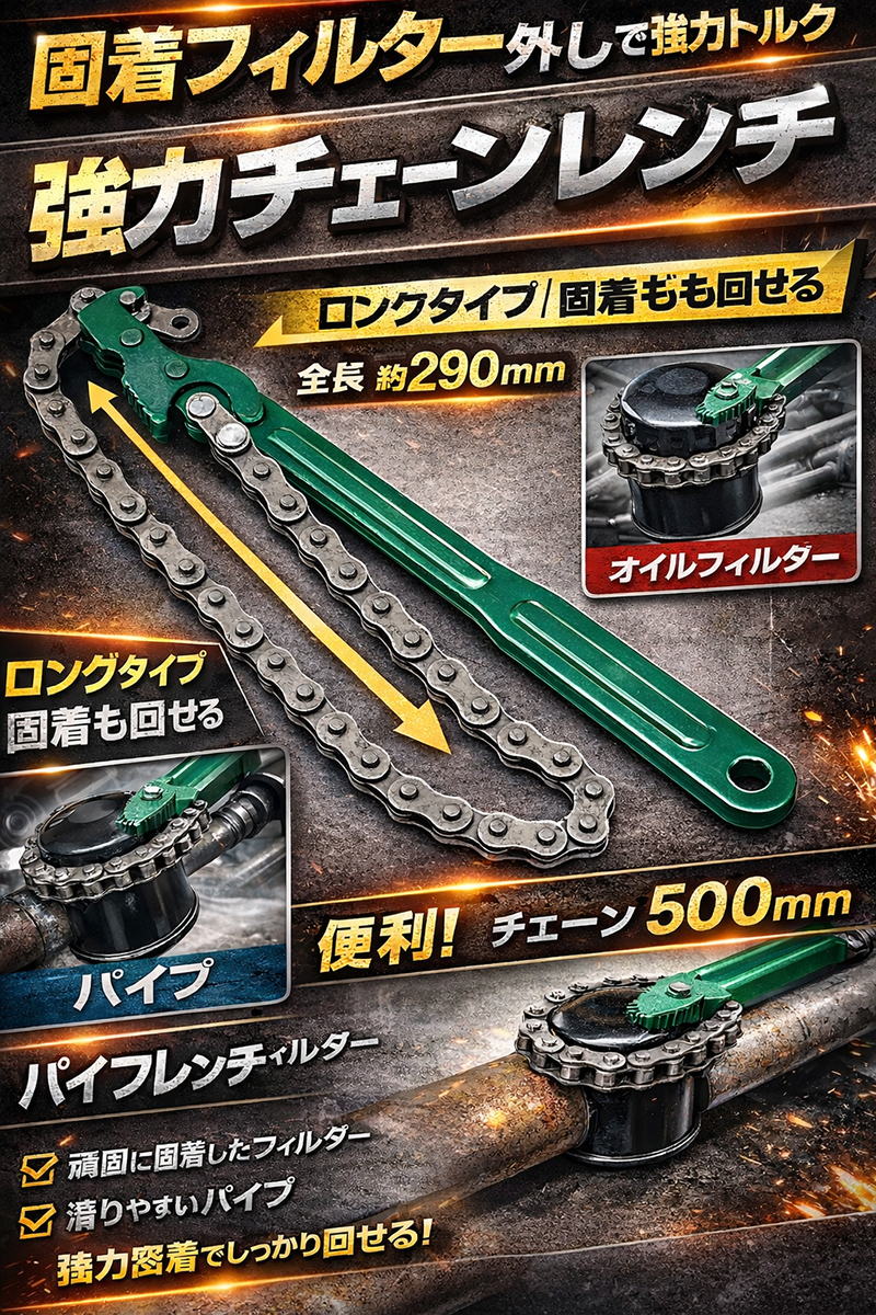 ● チェーン全長約500mm:大型パイプやフィルターにも対応