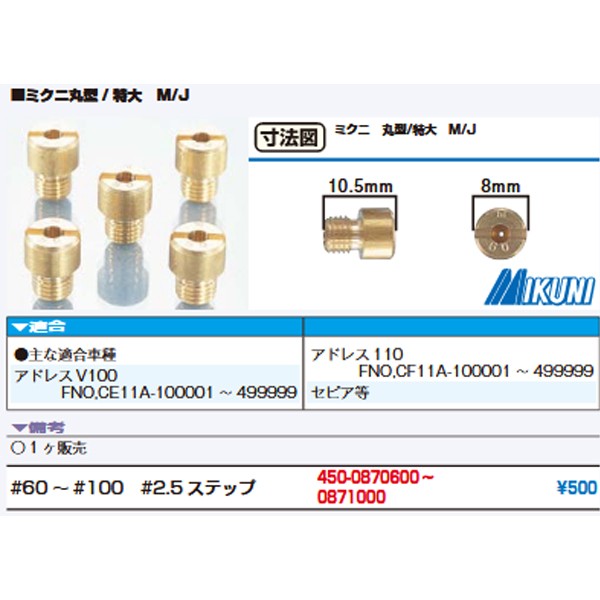 ミクニ 純正メインジェット 丸型 特大 M/J ♯60〜100 三国 セピア アドレス110 V100