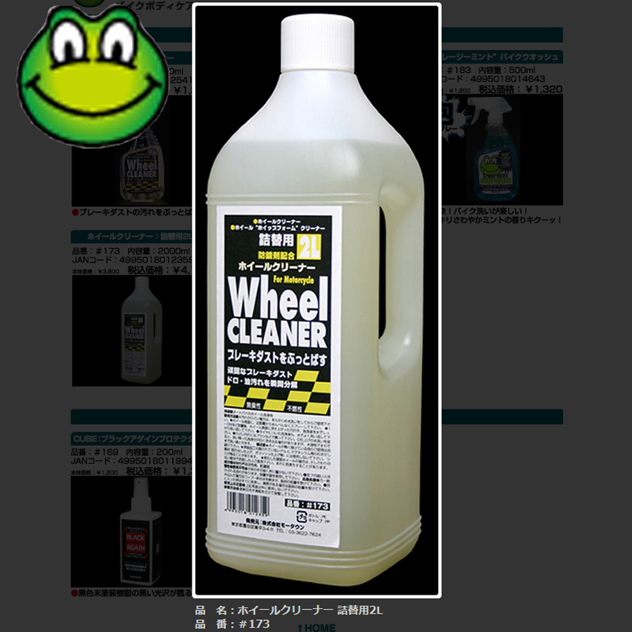 ●オートバイホイール用に開発した、植物系アルカリ性界面活性剤はスピーディーで強力な洗浄力を実現。頑固なブレーキダスト、ドロ・油汚れをスプレーして水洗いするだけで取り去ります。