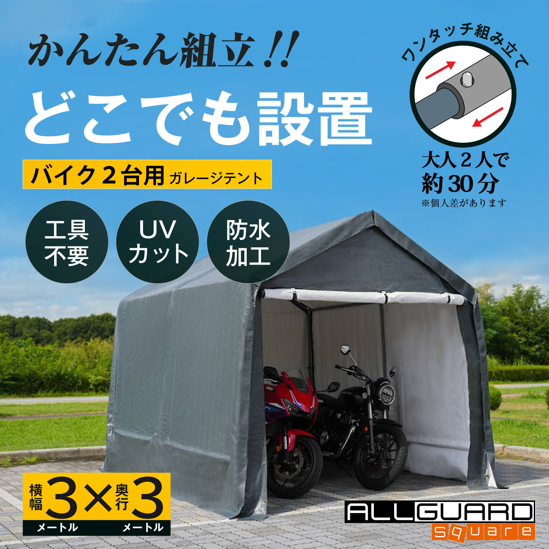 ALL GUARD square ガレージテント 3x3m カバー サイクルハウス バイク 自転車 一輪車 駐輪場 タイヤ 庭 屋根 倉庫 収納 物置