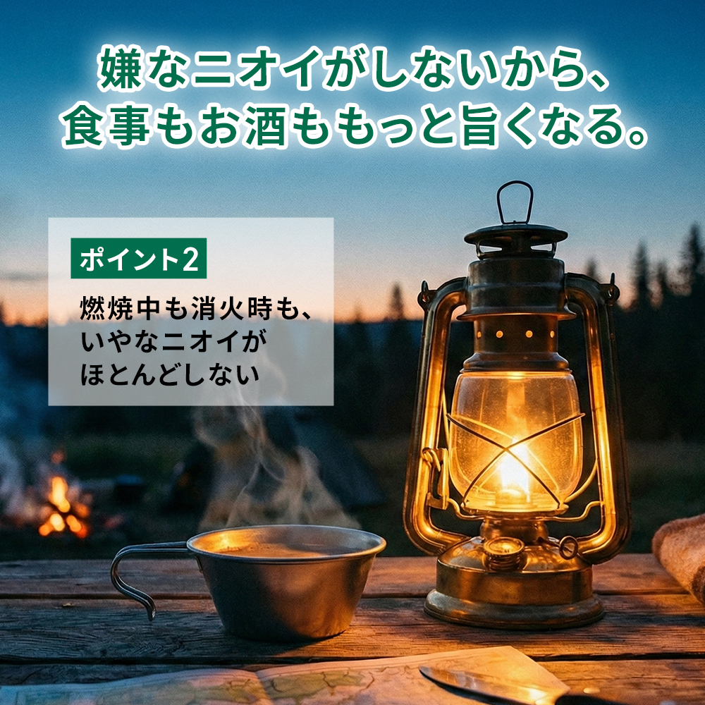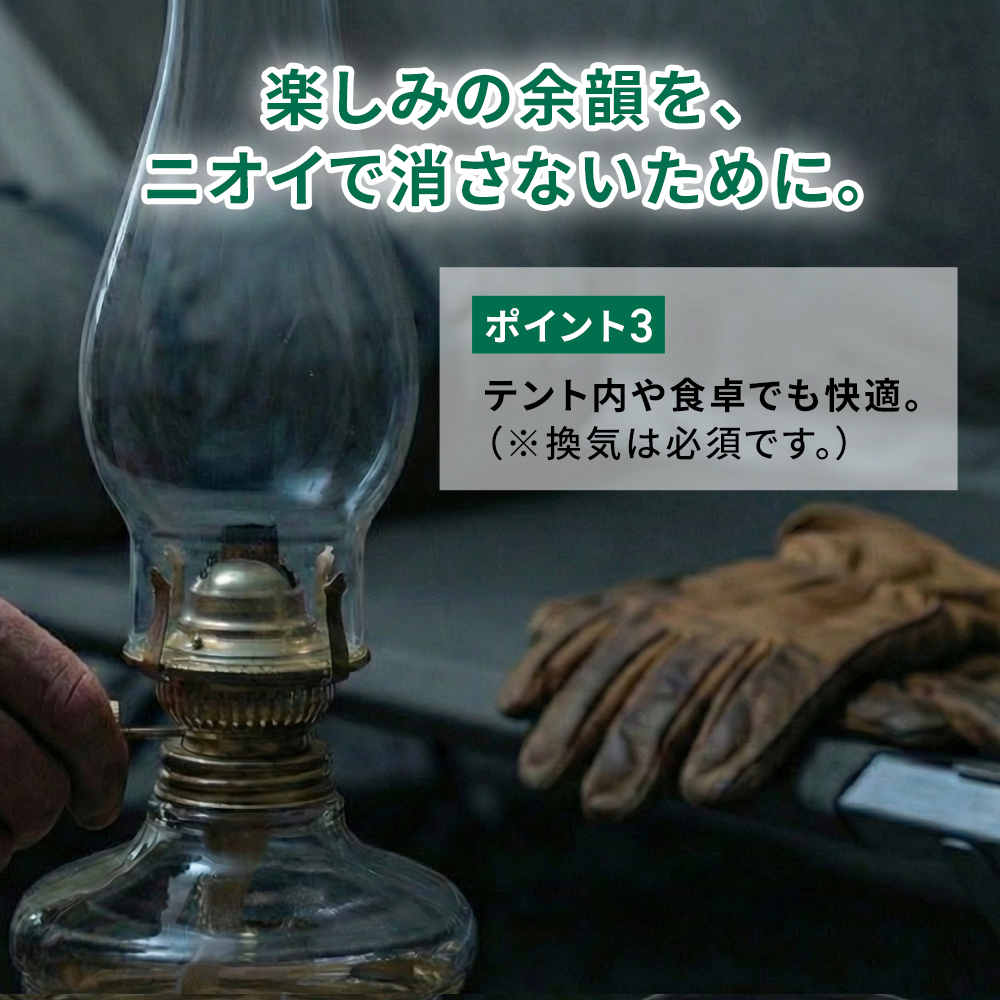 クリーンな燃焼: 高純度パラフィン系なので、気になる匂いやススが少なく室内でも安心。