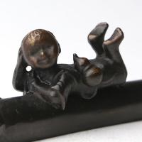 この文鎮は筆が生型鋳造、童が蝋型(ろうがた)鋳造というこだわりの鋳造法で作られています。