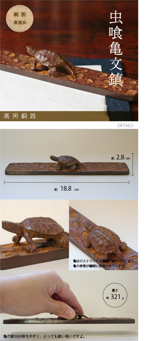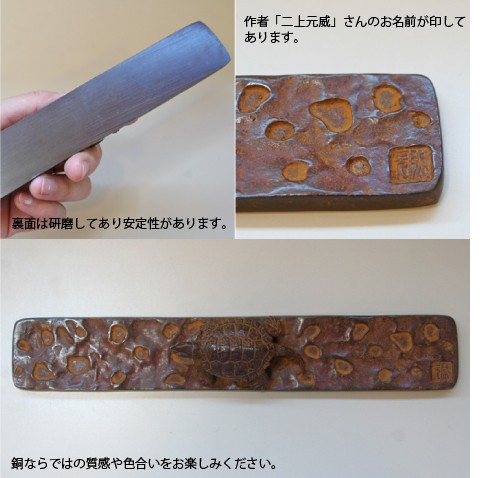 高岡で製作した銅製の文鎮のご紹介です。高岡銅器のこの文鎮は昔ながらの製法で鋳造し、そのほとんどの工程を手作業により行っています。亀はロストワックス鋳造という手間のかかる鋳造法で製作されており、小さいながらも細かな部分までリアルに表現され、可愛らしく作られています。銅ならではの質感や色合いをお楽しみいただけると共に、とても使いやすくなっています。お気に入りの道具で書道を楽しまれたり、程よい重量感があるのでペーパーウエイトとしてもお使いいただけますよ。ご自分用はもちろん、ちょっとした贈り物にいかがですか?