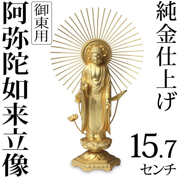 銅器・漆器の産地、高岡で製作した仏像です。阿弥陀如来は、西方極楽浄土を主宰(しゅさい)し、人々を救済する仏です。「南無阿弥陀仏」と念仏を唱える者は、その救いにあずかり、極楽浄土に往生するといわれます。戌(いぬ)年、猪(いのしし)年生まれの人の守り本尊です。浄土真宗お東用です。純金メッキ仕上げです。