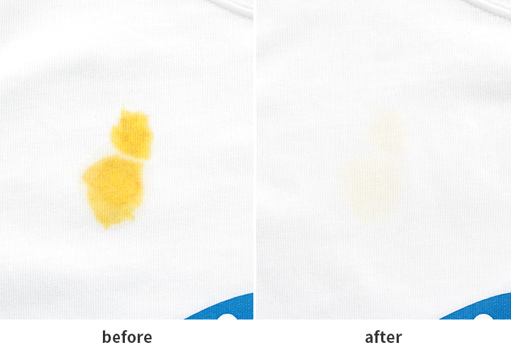 食べ物のシミの他、襟そでの皮脂汚れや化粧品汚れ、スポーツシーンでの汗や泥汚れなどの汚れにも効果を発揮。汚れの種類や経過した時間によって汚れ落ちの程度は異なるので、なるべく早めに洗う心がけが大切です。