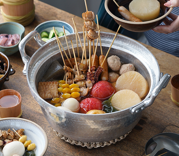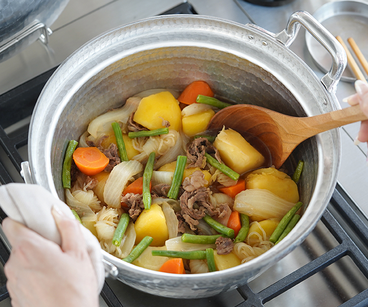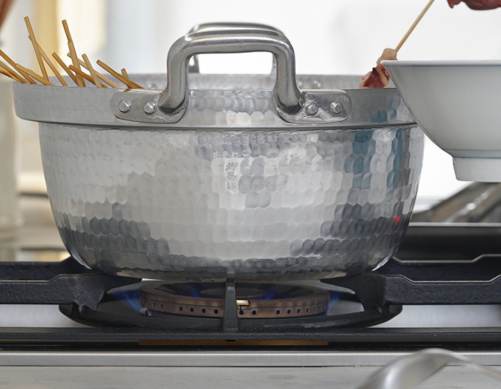 日本料理店においては行平鍋と併せて使用することで、8割以上の料理をまかなえると言われるほど大切な存在です。熱伝導に優れ、軽くて扱いやすく、内側に段が付いている日本独自の形状は、蓋をしても吹きこぼれにくく、おでんやシチューなどじっくりコトコト煮込む料理に最適です。