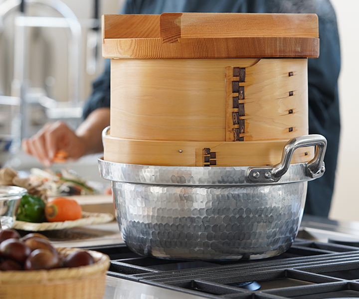 容量も大き目の段付鍋は、普段の料理作りはもちろん、たっぷりのお湯で山菜のあく抜きや筍の下茹でをしたり、ふちの部分にせいろを載せて蒸し料理に使ったりと幅広くお使いいただけます。