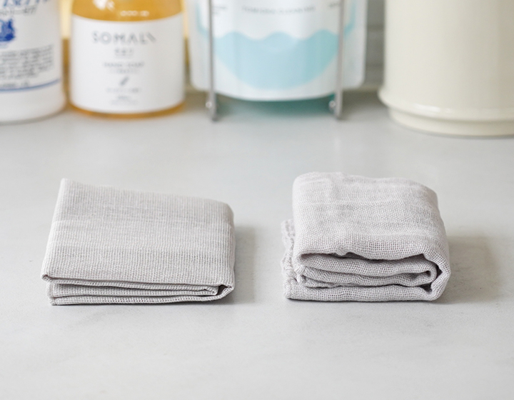 新品の蚊帳ふきんには、でんぷん糊がついておりパリッとしています。蚊帳織りの製造工程で糸が柔らかいと、織っている時に糸が切れたり、織り目がズレてしまうためです。