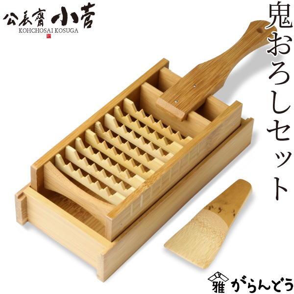 ![]() 鬼おろし 約W90×D275×H30mm | ![]() 鬼おろし セット おろし/約W90×D275×H30mm 受け皿/約W98×D205×H35mm へら/約W40×D100mm |
