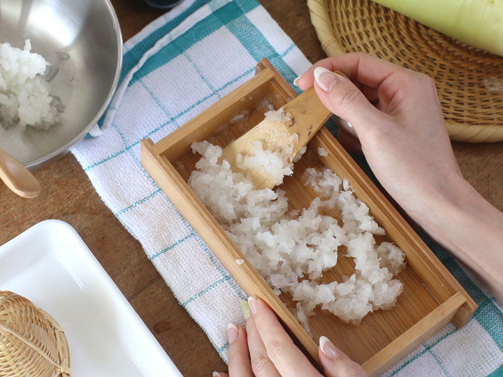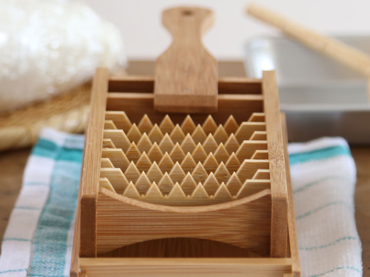 鬼おろしの大きな特徴は交互になった大きな歯。名前の由来にもなっており、頑丈な竹でできたとても鋭い歯です。おろす、というより粗く削るため、水分と栄養を逃さずシャキシャキとした食感になり、素材そのものの味と食感を楽しむことができます。