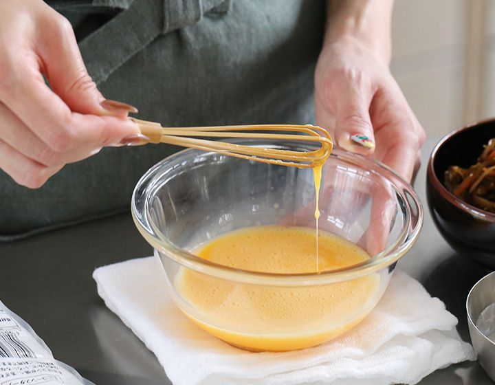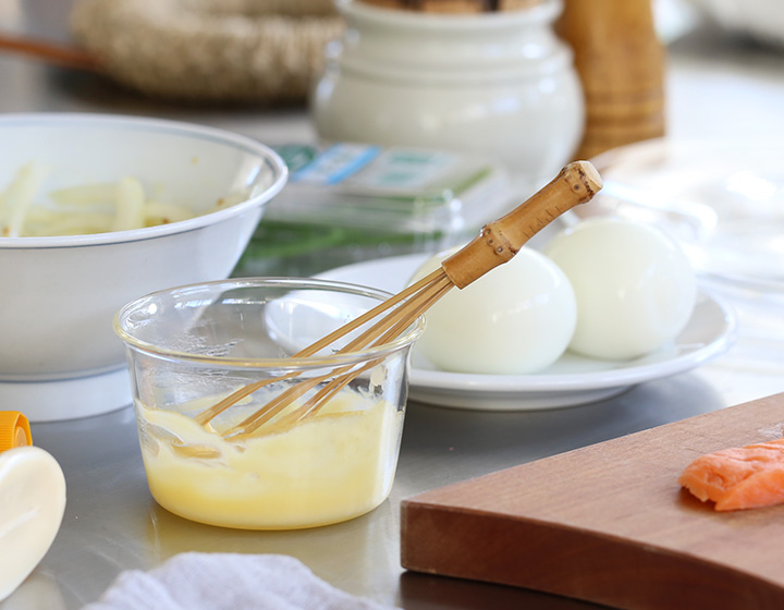 泡だて器を出すほどでもない、ちょっとしたものを混ぜたいときに小さな泡立て器はとても便利。箸やスプーンでは溶かしきれない底に溜まった砂糖や塩を溶かしたり、油と調味料をしっかり混ぜ合わせることができます。