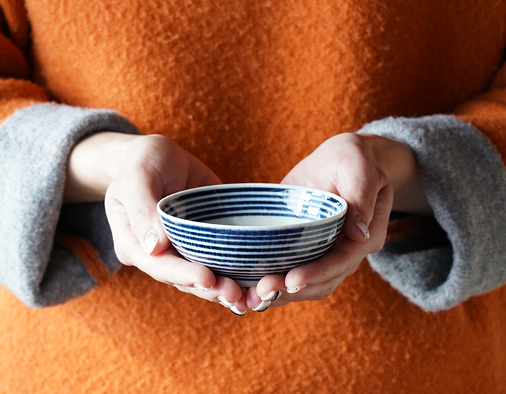 藍色の縞模様とグレーがかった白磁のコントラストがモダンな藍駒シリーズ。和食器になじみ深いその佇まいは使い勝手がよく、日々の食卓で活躍してくれます。