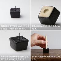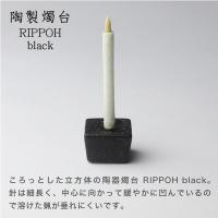 ころっとした立方体の陶製燭台RIPPOH black。針が細長いのでろうそくが立てやすく、土台は凸凹とした触り心地で、若干の光沢をもっています。中心に向かってゆるやかに凹んでいるので、蝋が垂れにくくなっている燭台です。色は黒、白、ベージュと三色あり、釉薬が違うため色や質感も違います。お好みのお色をお選びください。