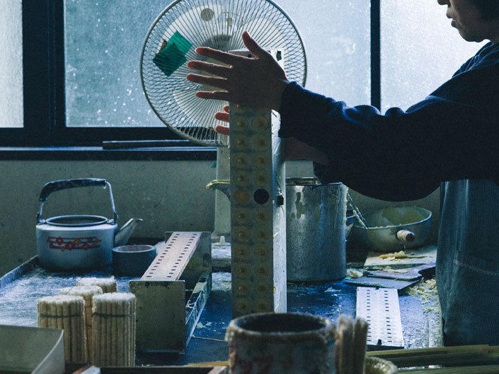 気温と湿度、蝋の温度と形を腕で感じながら和ろうそくを手掛けで製造する職人は、一人前になるまで10年掛かります。様々な季節でろうそくを制作する経験を通じて同じものが作れるようになっていくのです。