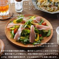 食卓での目線の角度を意識し、縁の反り上がり具合にこだわったデザイン、食材の瑞々しさが際立つ、木肌の質感を活かしたシンプルな仕上げ。
