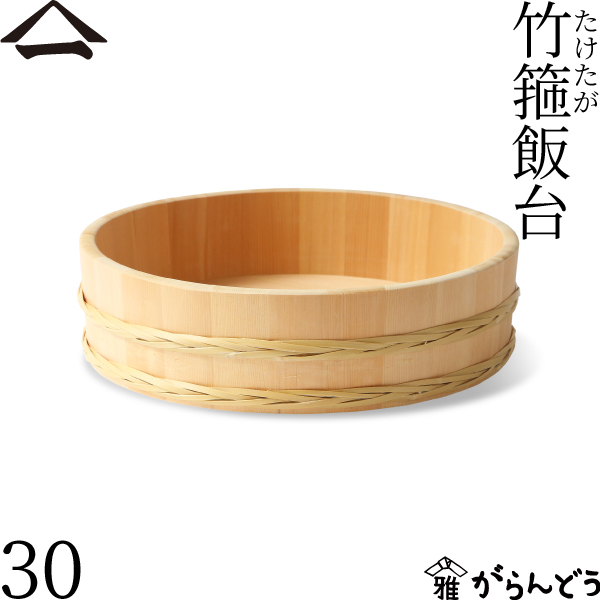 山一の竹箍(たけたが)飯台は昔からの技法で、桶やお櫃(ひつ)を固定する竹箍で作られています。作り手自らの目で選んだ竹を使い、手間がかかる「ぐい編み」という丈夫な組み箍でしっかりと締められています。