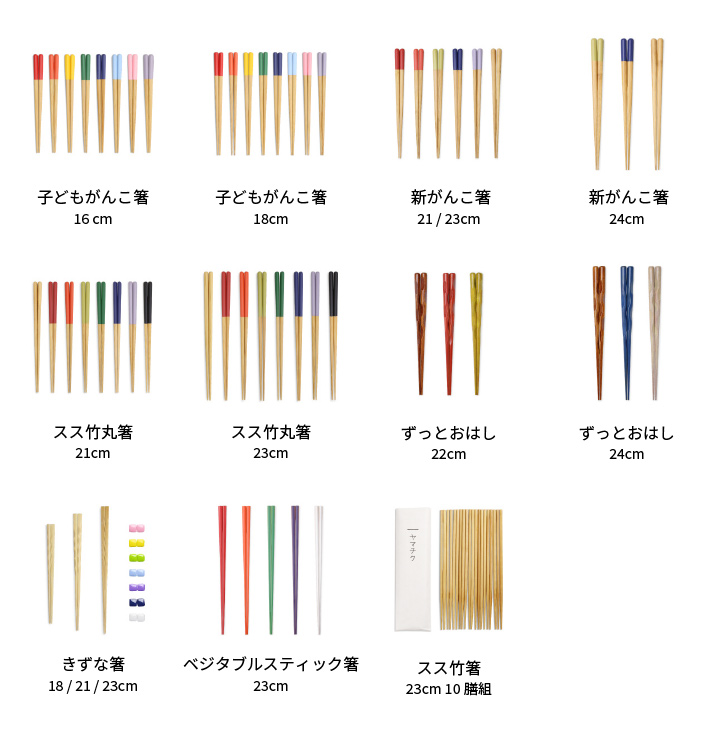 箸の色は8種類あり、食卓になじみやすい定番のヤマチクカラー。かわいくてお手頃なお箸ですので、家族の分も色違いで揃えたり、プチギフトにも。