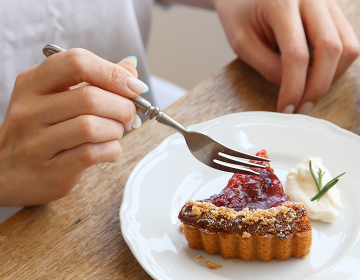 しっかりとした風合いのケーキフォークは、見た目通りやや重めの仕上がりですが、持ち手寄りの重心が絶妙で、安定してお使いいただけます。長い歴史で培われたサイズ感や使い心地は、定番にふさわしい佇まいを感じます。