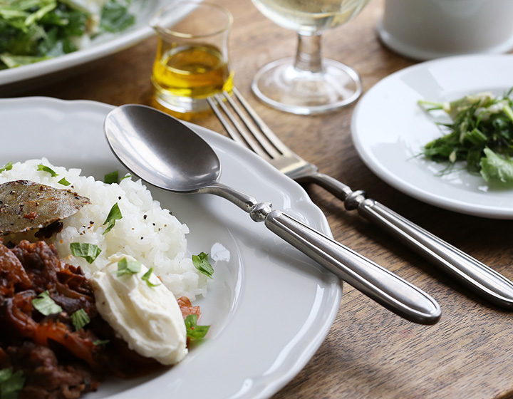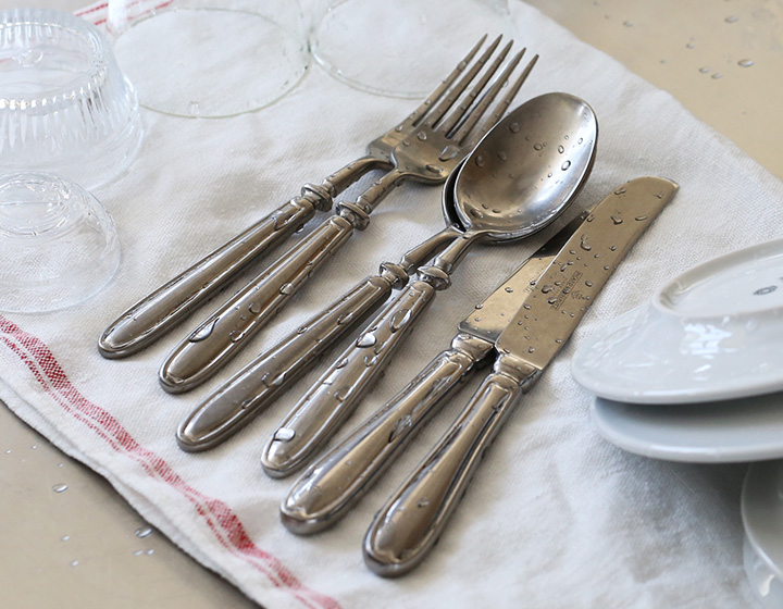 アンティークのように加工されたスプーンは、まるで使い込まれたような風合い。重厚感のあるカトラリーは、食卓を品のある雰囲気にしてくれます。