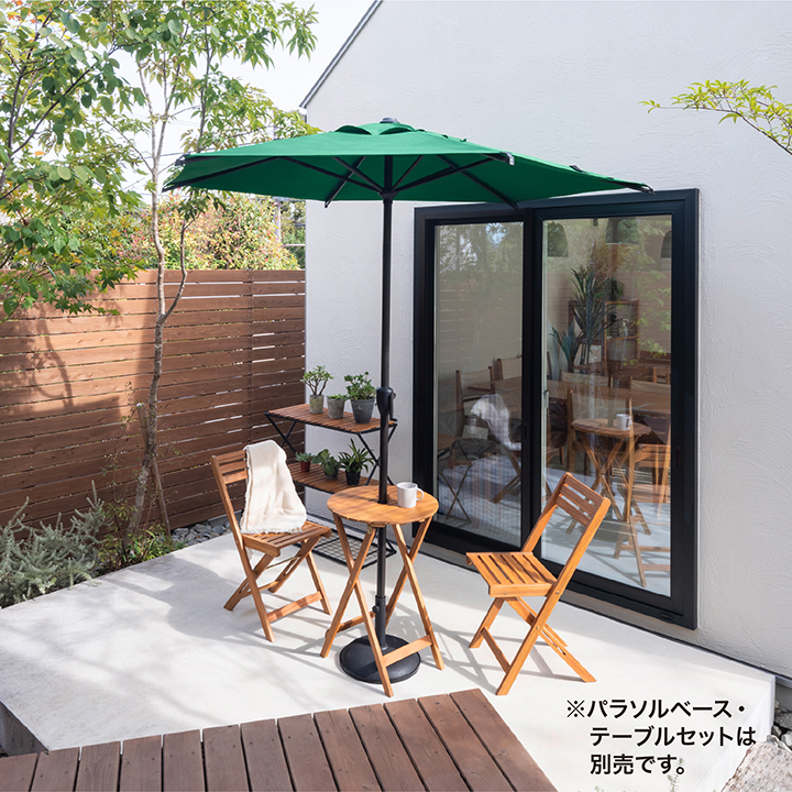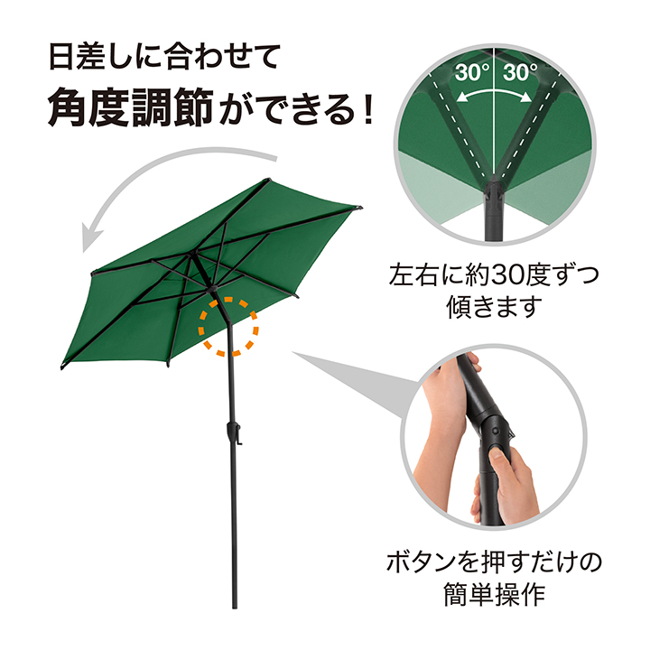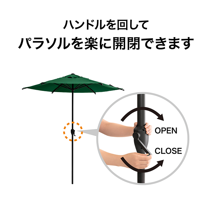 日差しの向きに合わせて傾き調節可能。クランクを回して開閉するおしゃれなパラソル。