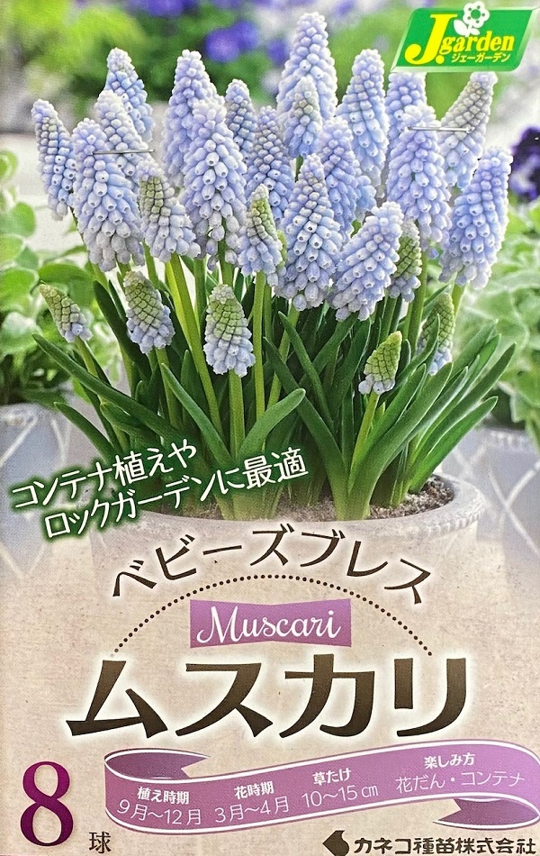 | ムスカリは栽培しやすく、春の花だんを華やかに彩ります。 小花を密につけてとても可愛く、花だんのふち取り、チューリップやスイセンなどとの寄せ植え、コンテナガーデニングなどに最適です。  | |