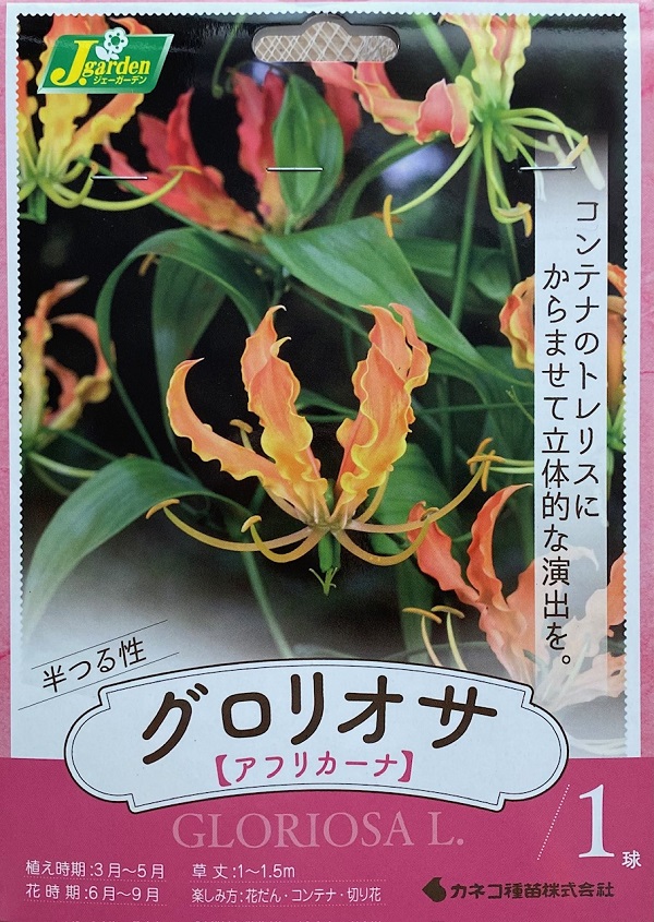 | 半つる性の球根植物で、トロピカルで豪華な花が人気です。 赤と黄色、葉の緑のコントラストが美しく、アレンジメントや鉢花にとても人気があります。 花持ちもよく、長く楽しめます。日当たりのよい場所で管理して下さい。 水が大好きなので、切れないように注意しましょう。トレリスや支柱を立ててください。 つるが伸びて次々と花を咲かせてくれます。 | |