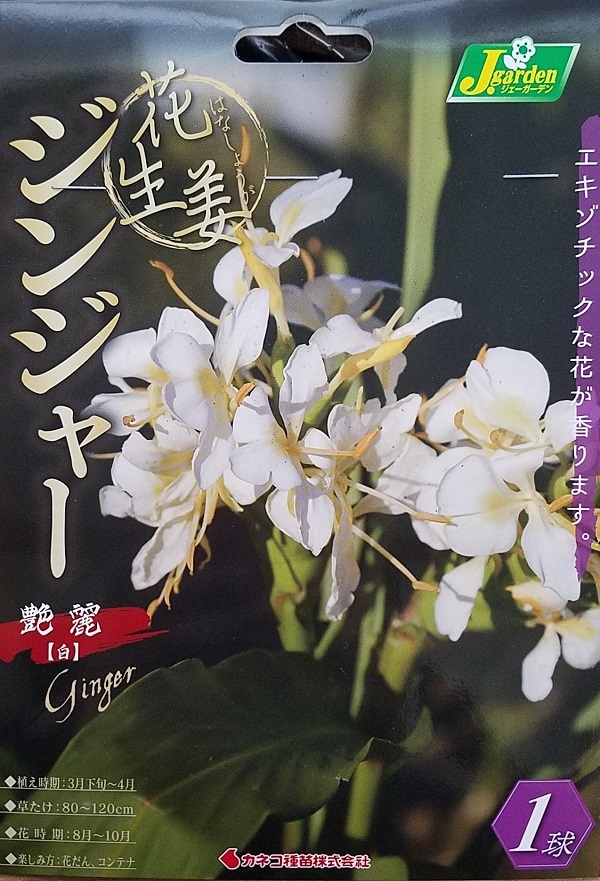 | 東南アジア、インド原産のショウガ科の植物。 ミョウガに似た茎葉に大きな花が、甘い芳香とともに咲きます。 寒い地方でも霜よけ程度で、数年間植えたままで大きな株になります。 花壇に適し、切り花にも利用できます。 | |