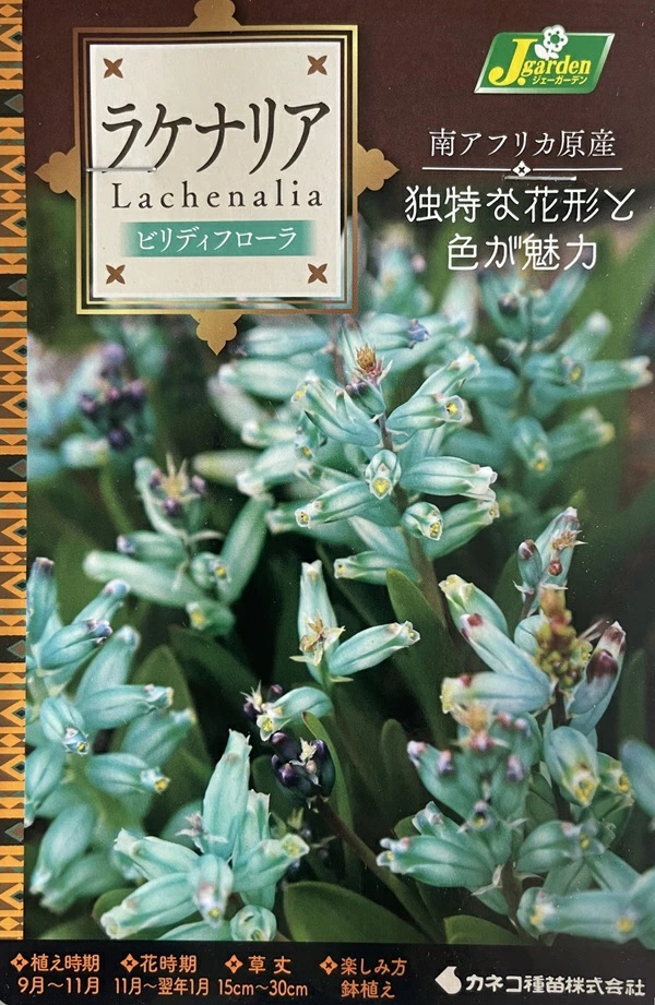 | ラケナリアは南アフリカに約100種類も分布する球根植物です。 鮮やかなグラデーションカラーが美しいこの品種は、ラケナリアの代表的な品種の一つです。 | |