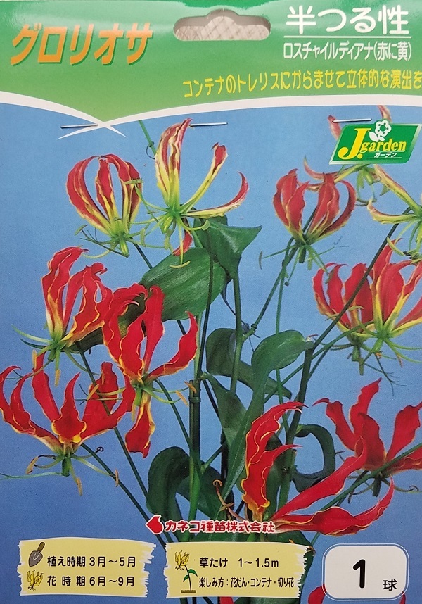 | 半つる性の球根植物で、トロピカルで豪華な花が人気です。 赤と黄色、葉の緑のコントラストが美しく、アレンジメントや鉢花にとても人気があります。 花持ちもよく、長く楽しめます。日当たりのよい場所で管理して下さい。 水が大好きなので、切れないように注意しましょう。トレリスや支柱を立ててください。 つるが伸びて次々と花を咲かせてくれます。 | |