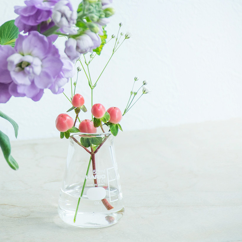 どこか懐かしいビーカーは、花瓶としても、インテリアに遊び心あるスパイスを添えてくれます。