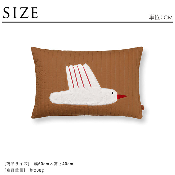 | 【[材質]】・カバー:GOTS認証オーガニックコットン100% ・中綿:リサイクルポリエステル ・クッション中材:フェザー&ダウン 【[カラー]】ブラウン 【[商品サイズ]】幅60cm×高さ40cm 【[商品重量]】約200g 【[生産国]】インド 【[特徴]】・物語のような空間を演出するクッション お子さまの寝室を心地よく彩るバードキルトクッション。 リビングのソファや子ども部屋のベッドに置くだけで、温もりある物語のような空間を演出します。 ・ferm LIVINGならではの世界観 他のブランドには見られない、ゆるやかで優しい雰囲気が特徴。 ナチュラルな素材感とやわらかな色使いが調和し、ferm LIVINGらしいオーガニックなデザインに仕上がっています。 ・こだわりの素材と手仕事 カバーにはGOTS認証を受けたオーガニックコットンを使用。 鳥は精巧なアップリケ技法で生地に縫い付けられており、装飾的なステッチがクッションに繊細な表情を与えています。 ・ふわふわ柔らかな触り心地 中材には再生ポリエステルを詰め、柔らかくふわふわと心地よい触感に仕上げました。 遊び疲れたお子さまが寄り添うのにぴったりです。 ■お手入れ方法 カバーは裏返しにして30℃でデリケート洗い。ファスナーは半分閉じた状態でご使用ください。 ■ferm LIVING(ファームリビング) 創設者であるTrine Andersen(トゥリーネ・アンデルセン)がデンマークで2006年に設立。 昔ながらの北欧デザインに沿いながらも、現代的なアレンジを加えており、北欧らしい温かみのあるカラーリングとシンプルで機能性を兼ね備えた他にはないユニークなデザインのブランドです。 日々の生活の心地よい刺激になるような機能性のあるデザインを追求しており、世界中の職人さんと協力することで、スカンジナビアの精神を持ちながらも各国の技術や伝統を活かしたモノづくりを行なっています。 |