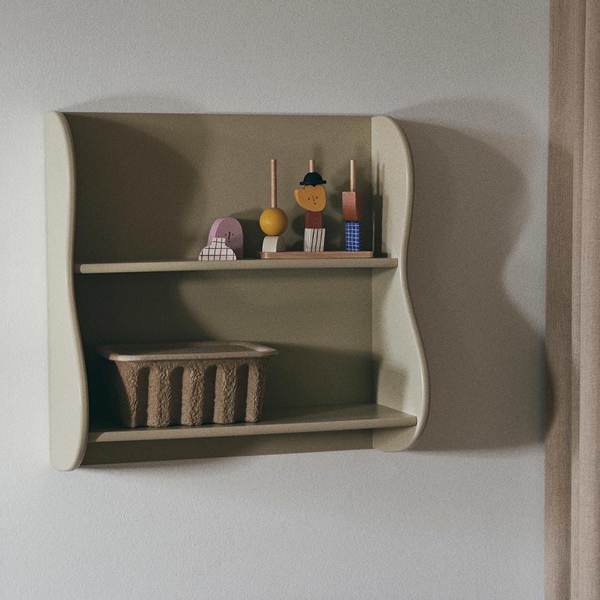 直線的な棚とは異なる穏やかなラインが、子ども部屋に自然のやさしさと遊び心をもたらし、空間を印象的に演出します。