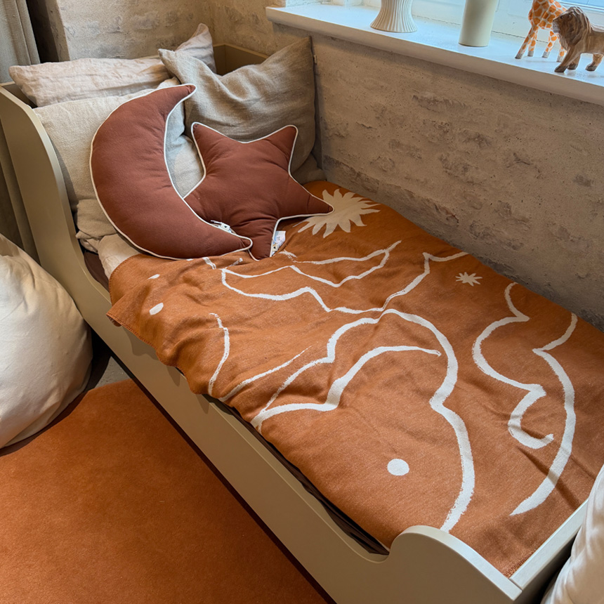 | 【材質】コットン100% (綿100%) 【サイズ】縦120cm×横80cm 【重さ】320g 【特徴】■星空を楽しむスカイブランケット リバーシブル仕様で仕立てられたスカイブランケット。 愛らしい星空模様と、装飾的なステッチの縁取りがやさしいアクセントとなり、空間に穏やかな表情を添えます。 ■やわらかく心地よい素材感 柔らかく起毛したコットン素材を使用し、包み込まれるようなあたたかさが魅力。 お子様がリラックスして過ごす時間や、心地よい眠りの時間に最適です。 ■空間を彩るやさしいデザイン ベッドやソファに掛けるだけで、星空のような穏やかな雰囲気を演出。 日常の中に、ゆったりとした夜の時間を感じさせてくれます。 ■くつろぎのひとときを演出 ブランケットに包まりながら、夜空の星を思い浮かべるようなひとときを。 やさしく心をほどく時間を取り入れていきましょう。 【生産国】Portugal |
