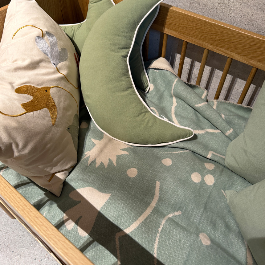 愛らしい星空模様と、装飾的なステッチの縁取りがやさしいアクセントとなり、空間に穏やかな表情を添えます。