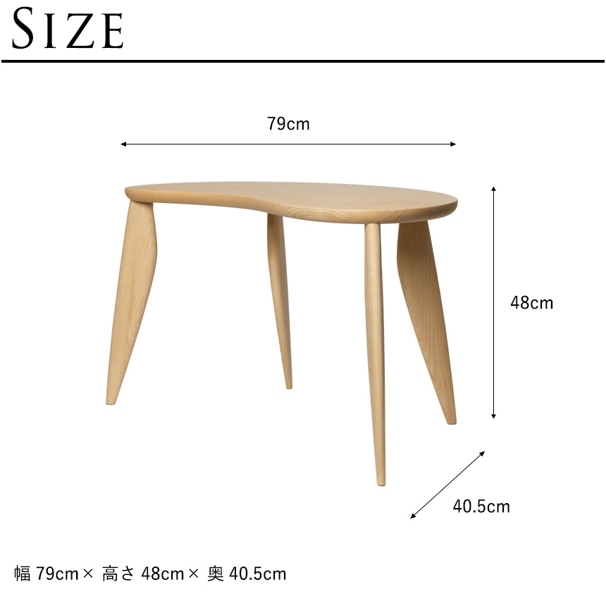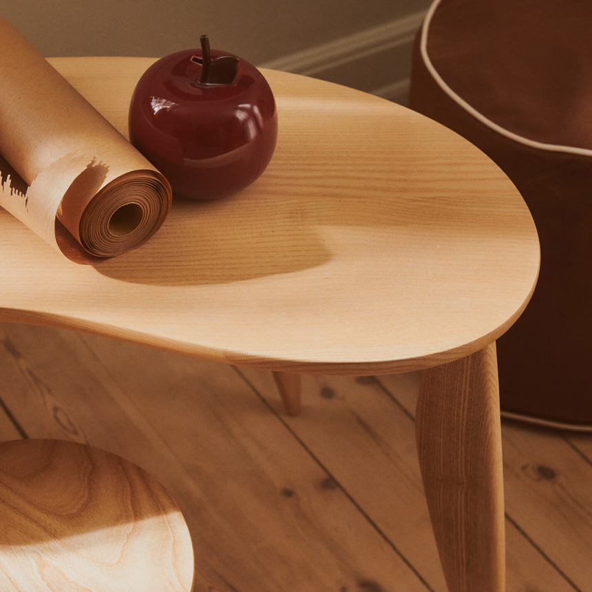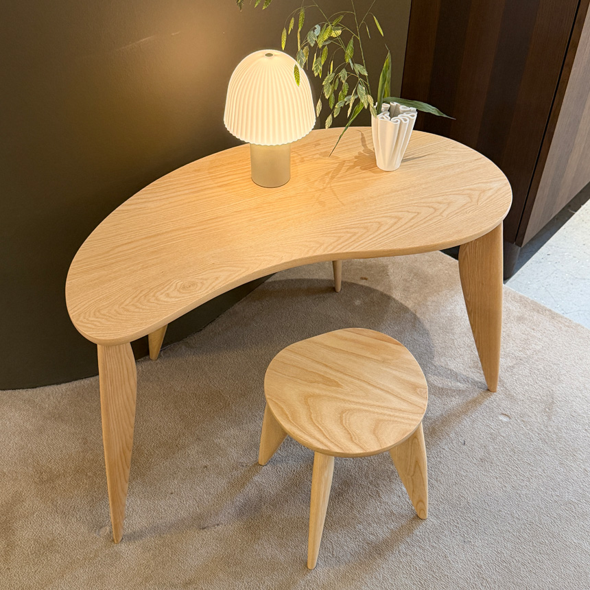 フランス語で「豆」を意味するFeveの名の通り、左右非対称の天板と細長く伸びた楕円形の脚が特徴。
