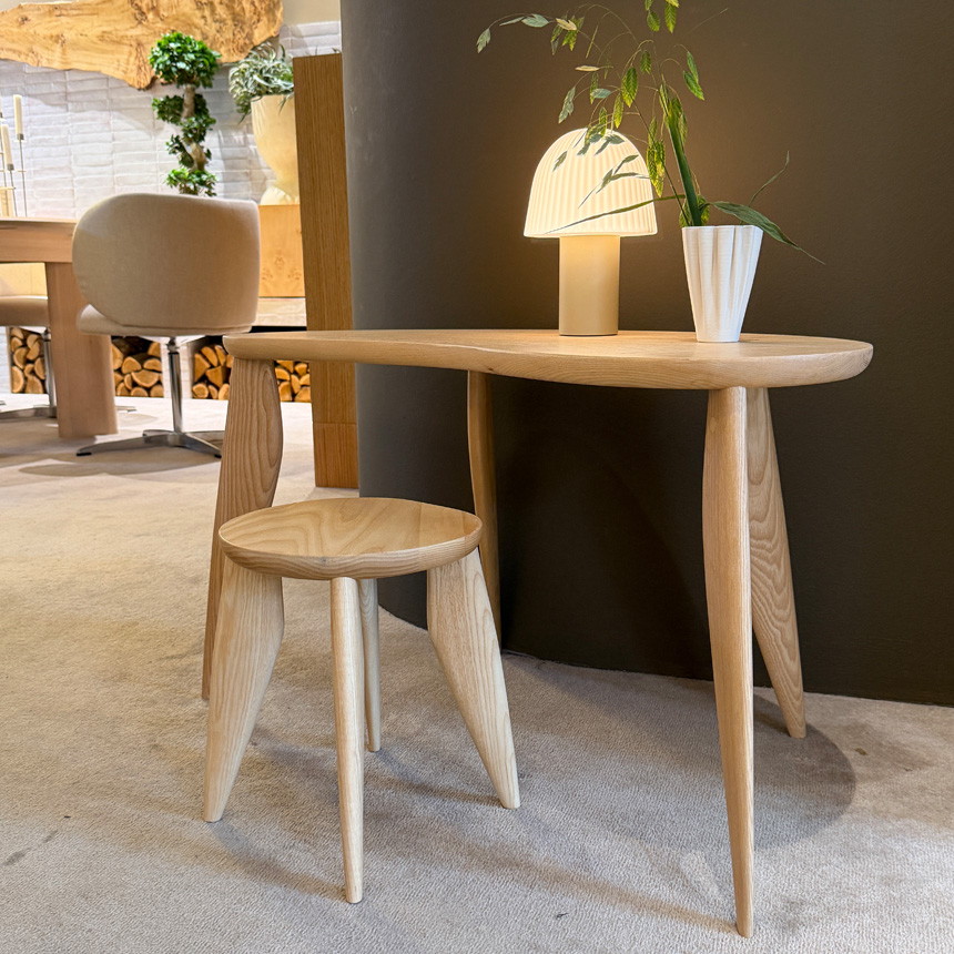 有機的で大らかな曲線を描く天板と、彫刻のように削り出された脚部が、エレガントで洗練された印象を与えます。