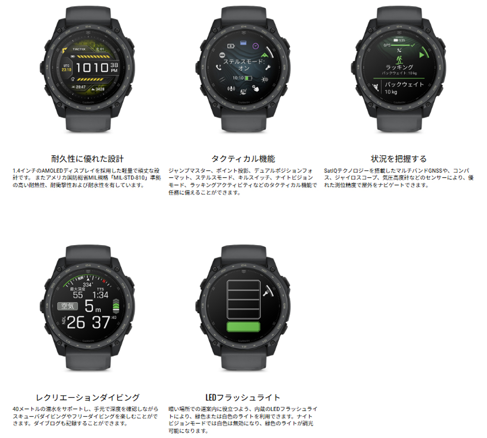 tactix 8 AMOLED Cerakoteは鮮やかなAMOLEDディスプレイ、Cerakoteコーティングチタンベゼル、サファイアレンズ、タクティカル機能などを備えた究極のタクティカルスマートウォッチです。