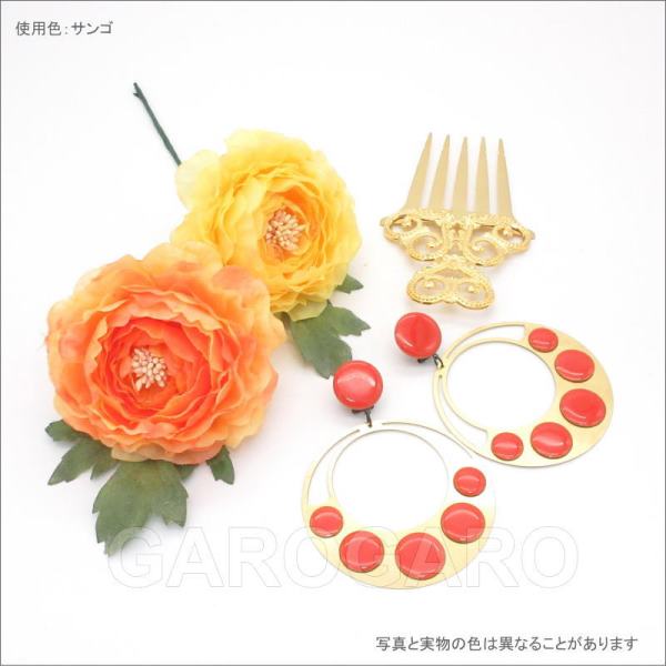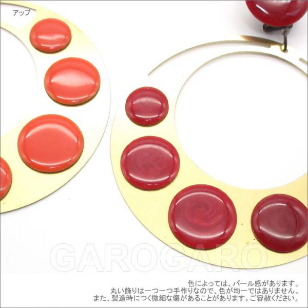 おすすめポイント: ■水玉の色もバリエーションが豊富で、色の系統ごとに4ページに分けて販売しています。 フラメンコらしい大きな輪とカラフルな水玉が華やかなデザインです。 薄くて軽いので扱いやすいイヤリングです。 --- 【ピアス針なし】クリップとねじで留める日本式の留め具を使用しています。 --- 素材: プラスチック・金属 サイズ(縦の長さ×横幅)cm: 約10.0(飾り部分の長さ:7.5)×7.5 (掲載のサイズは製品の実測値です。多少の個体差がありますがご容赦ください。) 【コーディネイト例】 ・ラナンキュラス一輪のコサージュ 色:オレンジ、黄 ・メタルのペイネタ(櫛) Amor(アモール) 色:ゴールド |