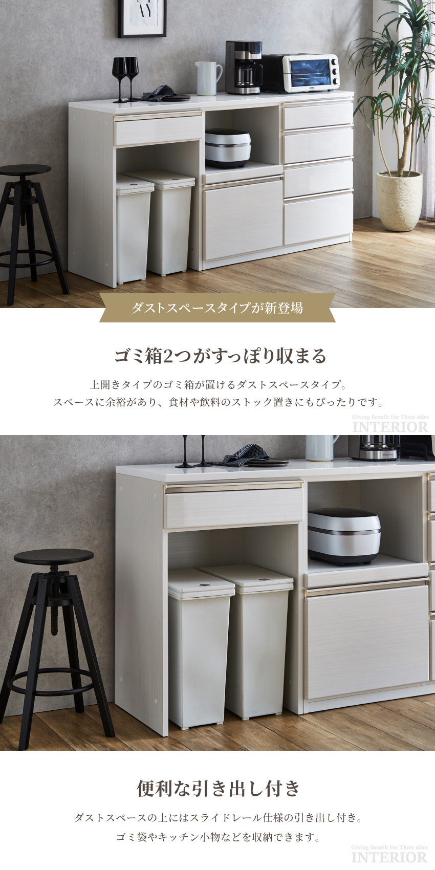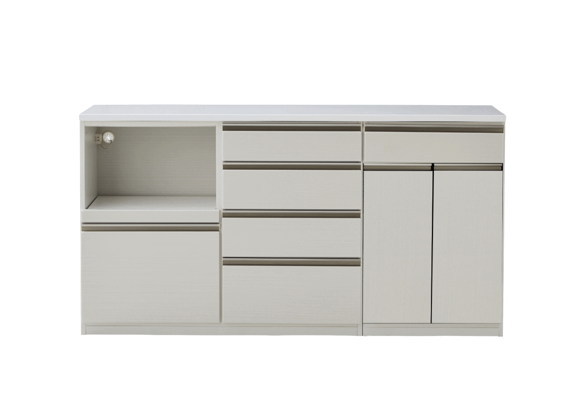 | キッチンに圧迫感を与えないカウンタータイプ。収納部分は左右入れ替え可能ですので、自分好み好みの配置が叶います。使いやすい3タイプの収納エリアを備えており、物に溢れがちなキッチンが綺麗に片付きます。オープン収納部分には湿調機能があるモイスと1500Wまで使用可能なコンセント付き。そのほか、2Lペットボトルが入る大型の引き出しや可動棚など充実の収納機能を完備しています。 | ||