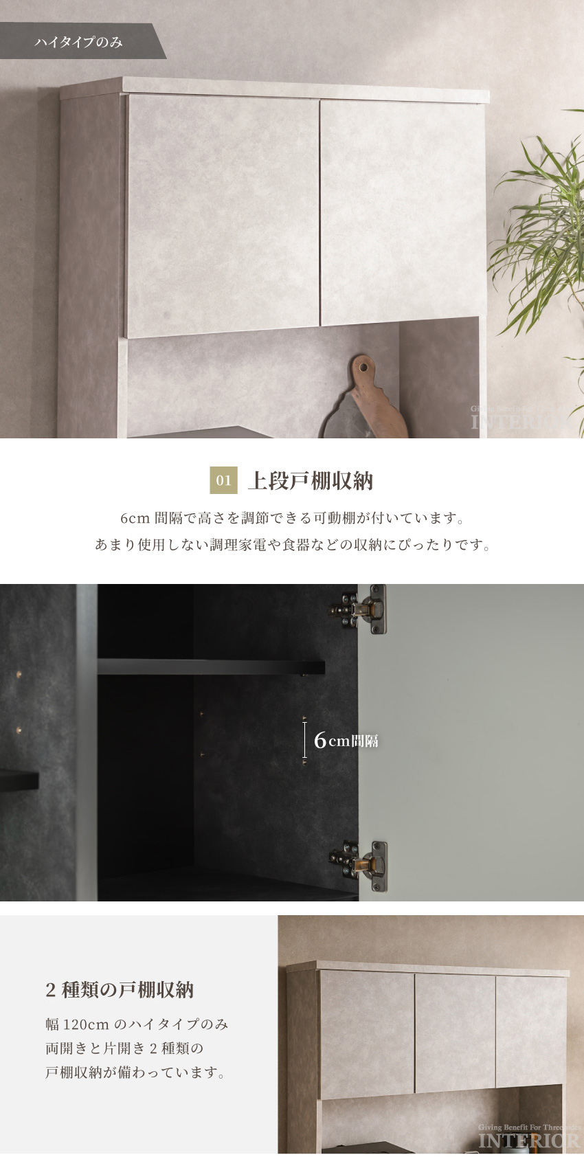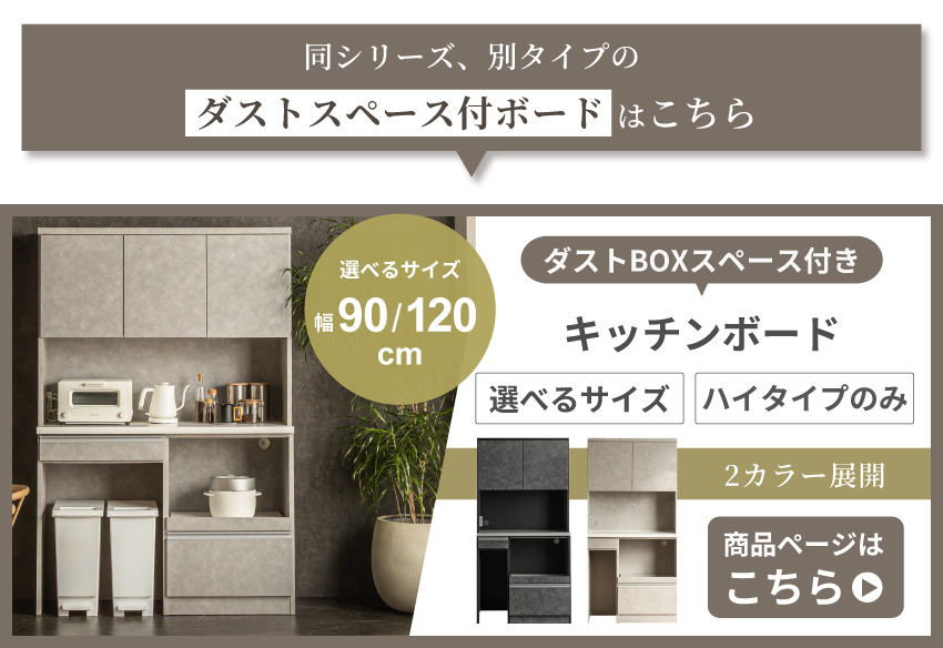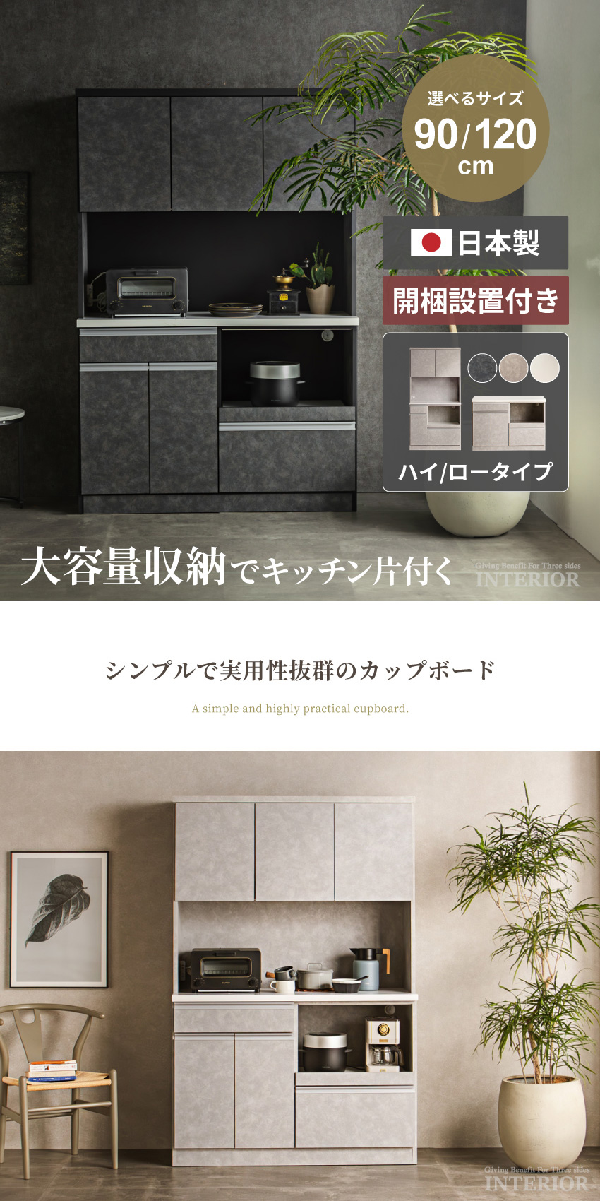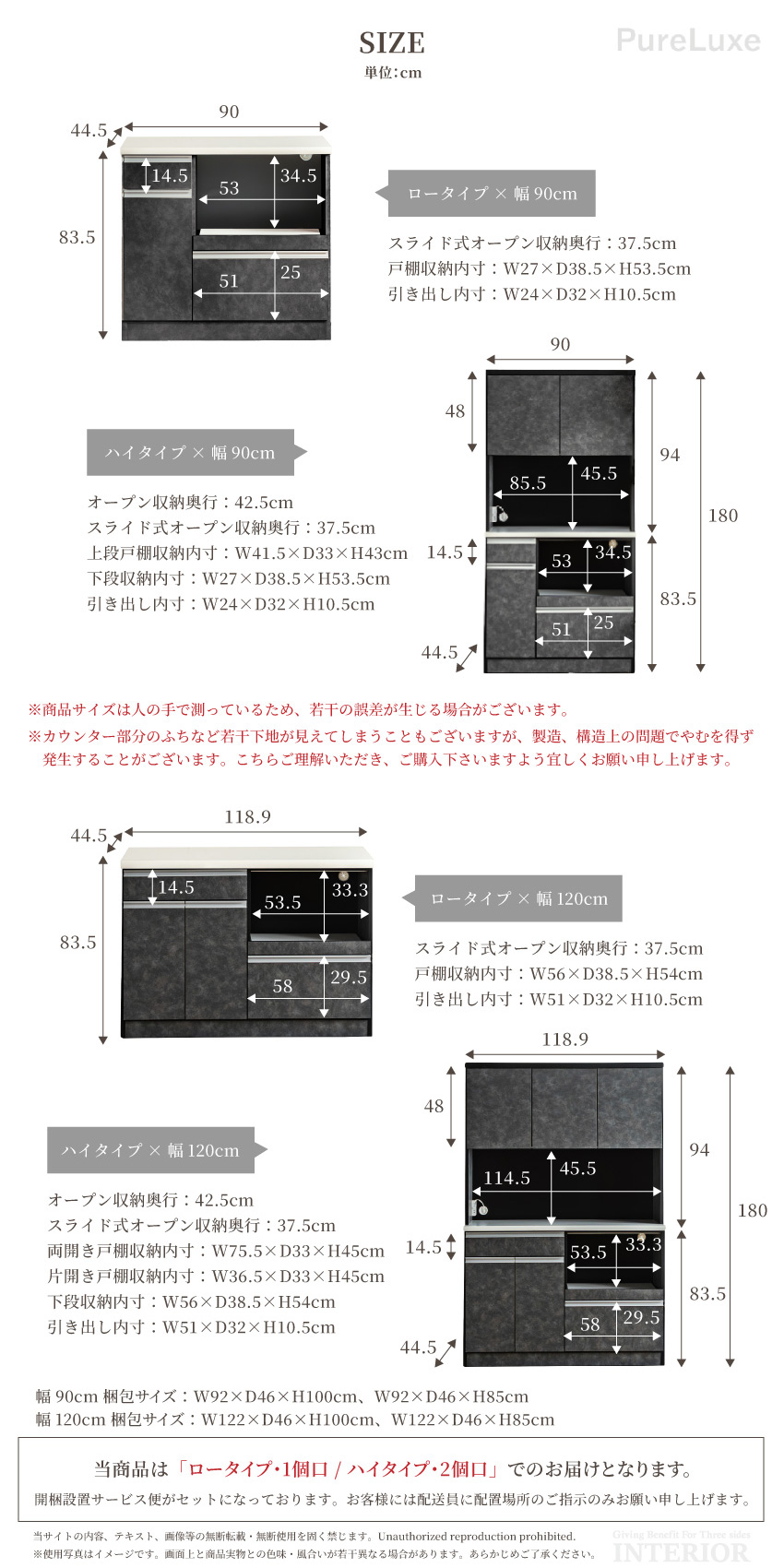 | 90幅(ロータイプ):W90×D44.5×H83.5cm 120幅(ロータイプ):W118.9×D44.5×H83.5cm 90幅(ハイタイプ):W90×D44.5×H180cm 120幅(ハイタイプ):W118.9×D44.5×H180cm 90幅梱包サイズ:W92×D46×H100cm、W92×D46×H85cm 120幅梱包サイズ:W122×D46×H100cm、W122×D46×H85cm 【耐荷重・90幅】 上棚/下段:約8キロ、棚板約5キロ カウンター天板部分:約20キロ 中央右スライド引きだし:約10キロ 中央左引出し:約5キロ 左下開き扉:下段約10キロ、棚板約5キロ 右下引出し:約15キロ 【耐荷重・120幅】 上棚/下段:約8キロ、棚板約5キロ カウンター天板部分:約20キロ 中央右スライド引きだし:約10キロ 中央左引出し:約7キロ 左下観音開き扉:下段約10キロ、棚板約5キロ 右下引出し:約15キロ | ||