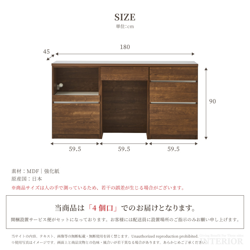 | 天板:W179.4×D45×H3cm 引き出し下台:W59.5×D44.2×H90cm OP下台:W59.5×D44.2×H90cm オープンダスト下台:W59.5×D44.2×H90cm | ||