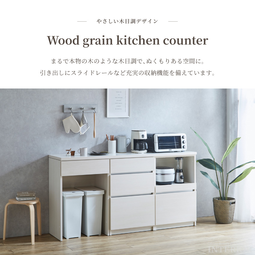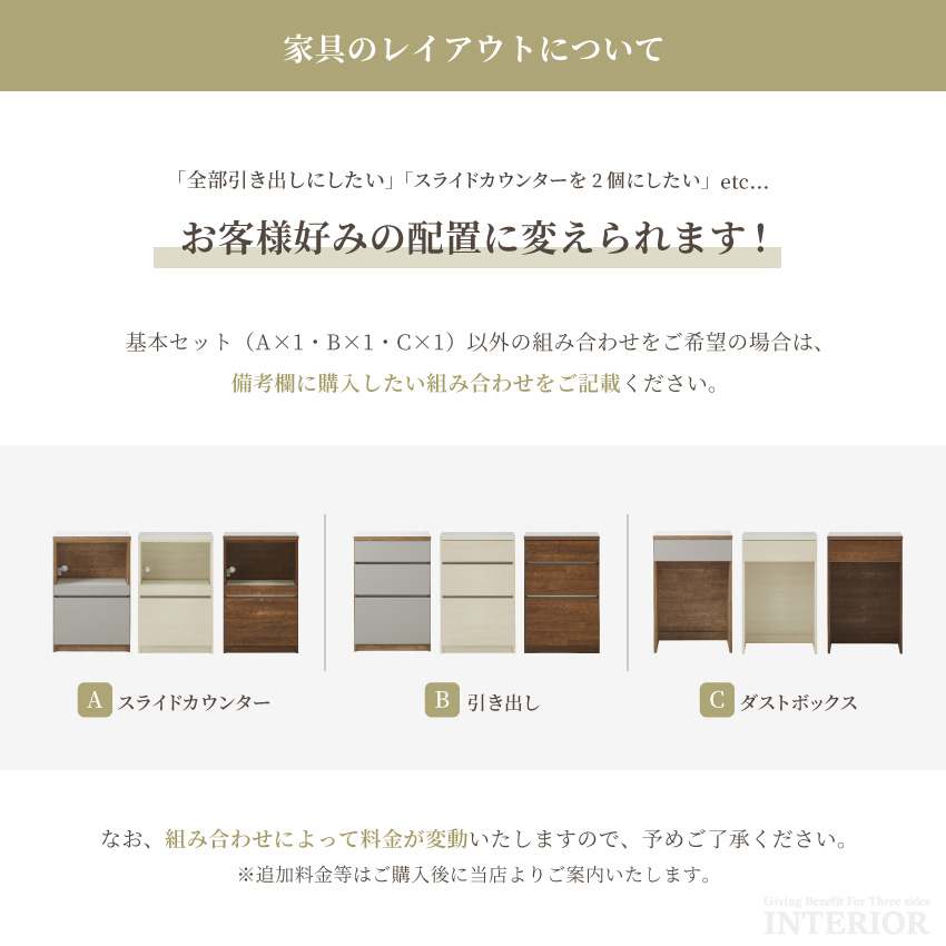 | 永く使える高品質な国産キッチンカウンター。お部屋に合わせて形が変えられるフリーレイアウトデザインで、自分好みの配置が叶います。お客さまのご希望に合わせて組み合わせを変更することも可能です。(詳しくは当店までお気軽にご連絡ください。)キッチン周りがすっきり片付く充実の収納機能を備えており、食器や調理家電、ダストボックスまでこれ1つにまとめられます。カラーはホワイトとブラウン、ナチュラルグレージュの3色をご用意しております。 | ||