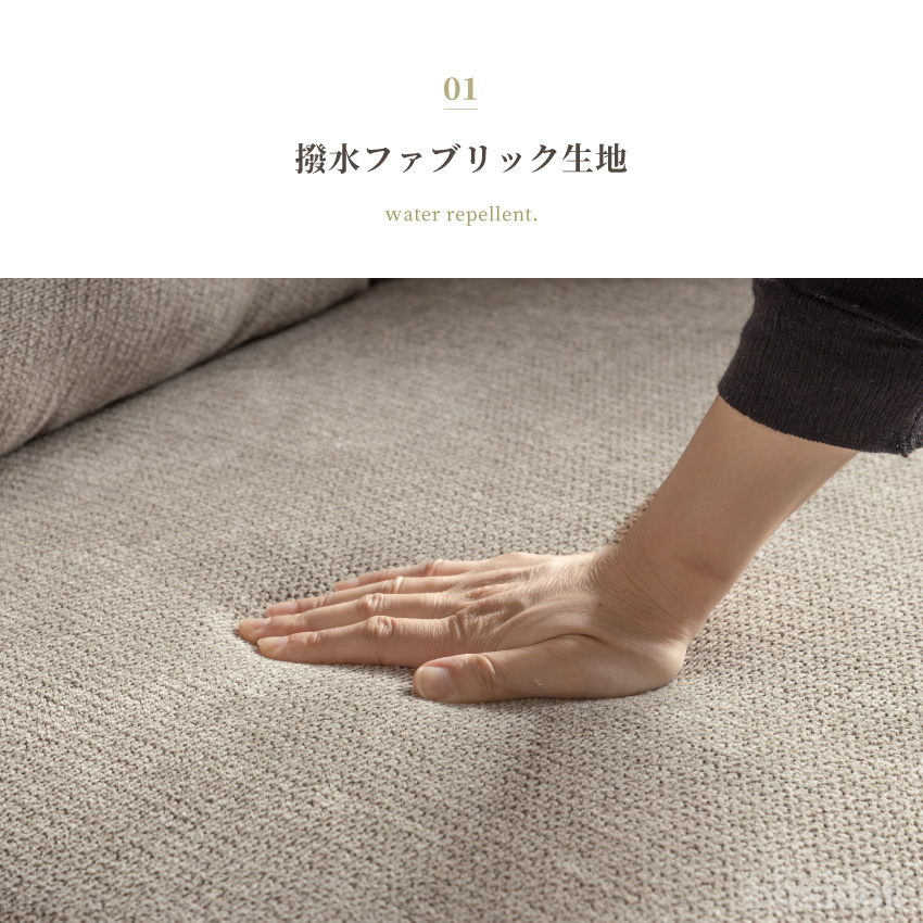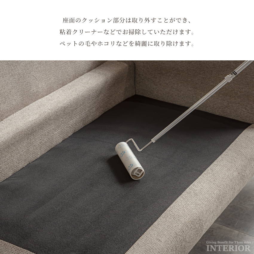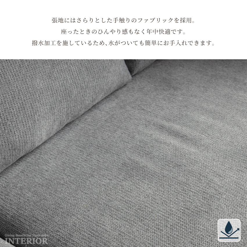 | 撥水ファブリックを使用したカウチソファ。水滴や汚れがついてもお手入れしやすく、ペットやお子さまがいるご家庭にもおすすめです。座面は適度な弾力があり、沈み込みすぎないため長時間座っていても疲れにくいです。背面にはふかふかのクッションが3つ付いており、優しく体を支えます。座面クッションは取り外し可能で、汚れが溜まりやすい部分も簡単にお手入れできます。カラーはグレー・ライトブラウン・ネイビーの3色をご用意。 | ||