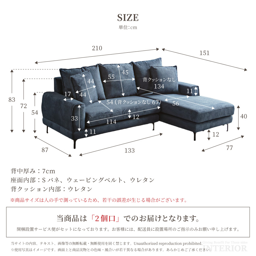 | 表面材:ファブリック(撥水生地) 脚:アイアン(12cm) 座面:Sバネ、ウェービングベルト、ウレタン 背クッション:ウレタン | ||