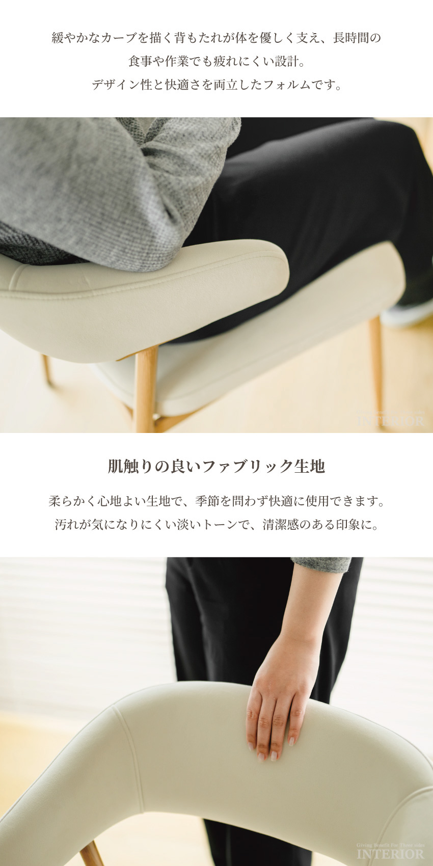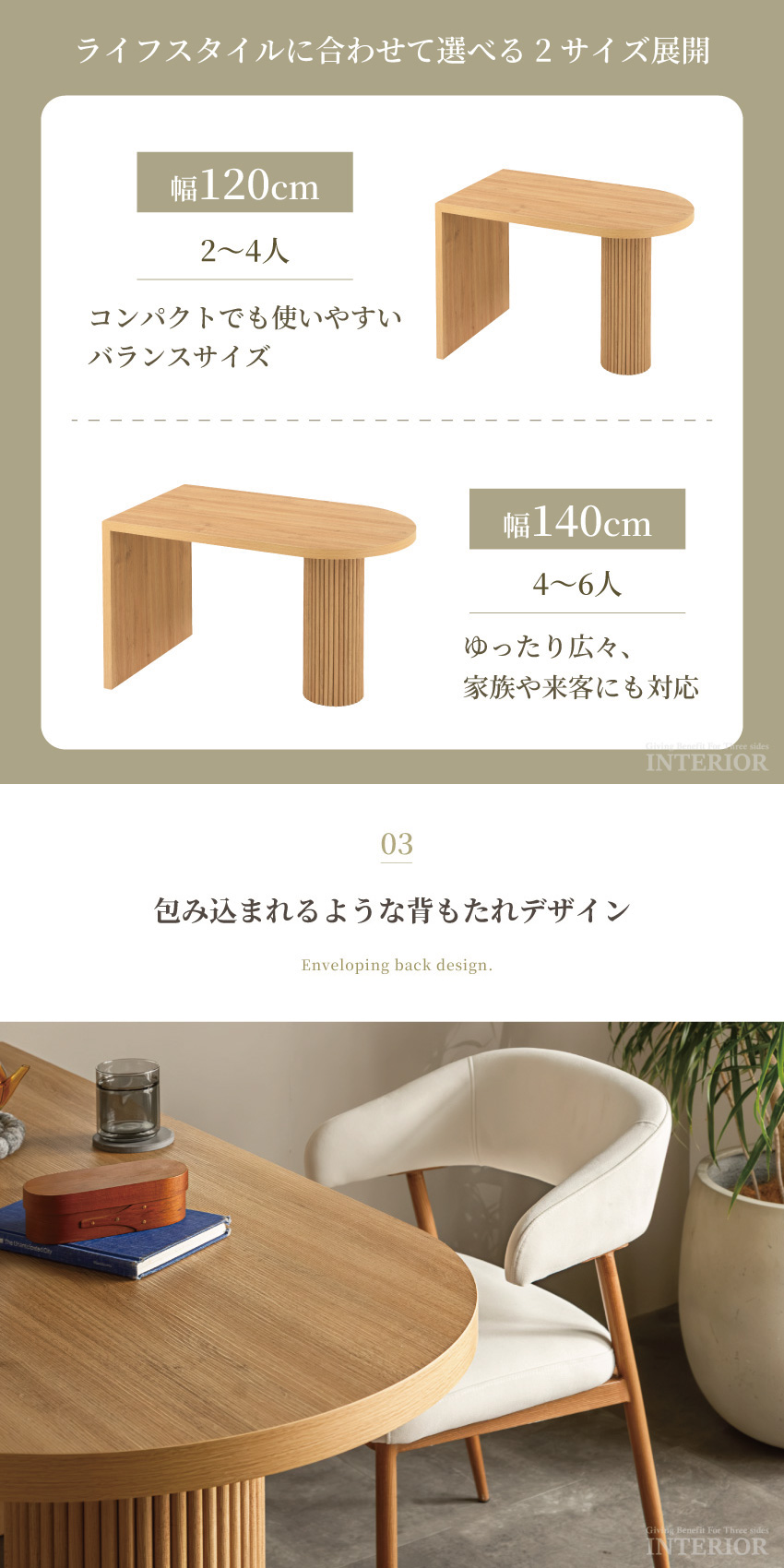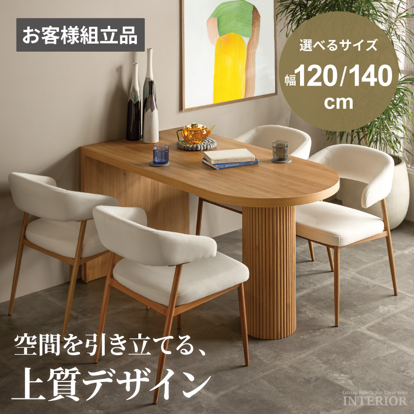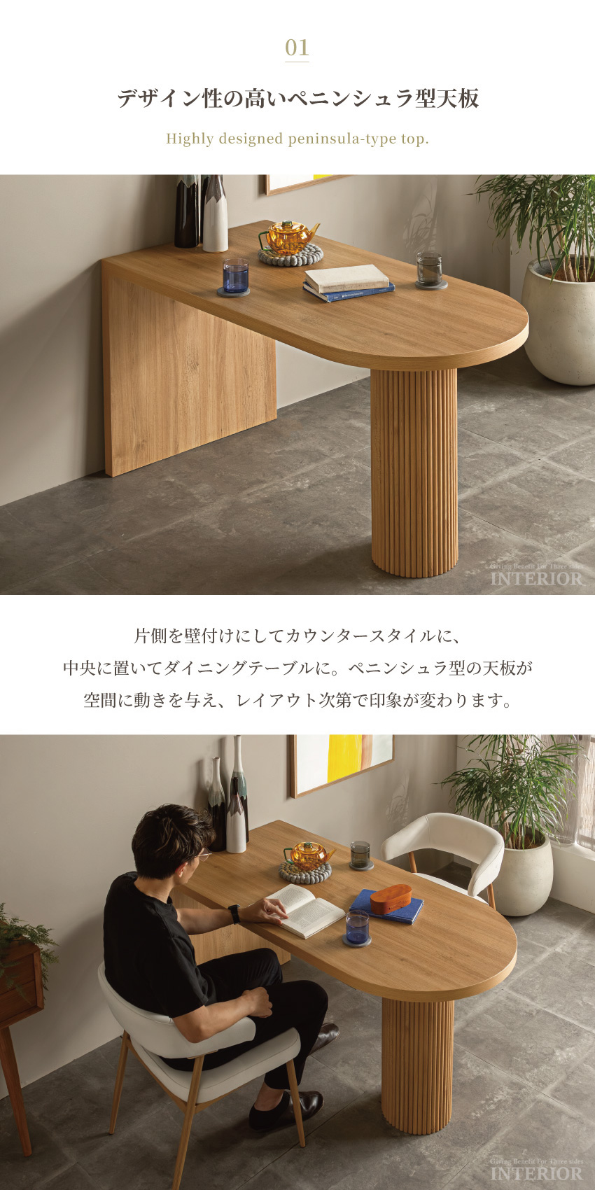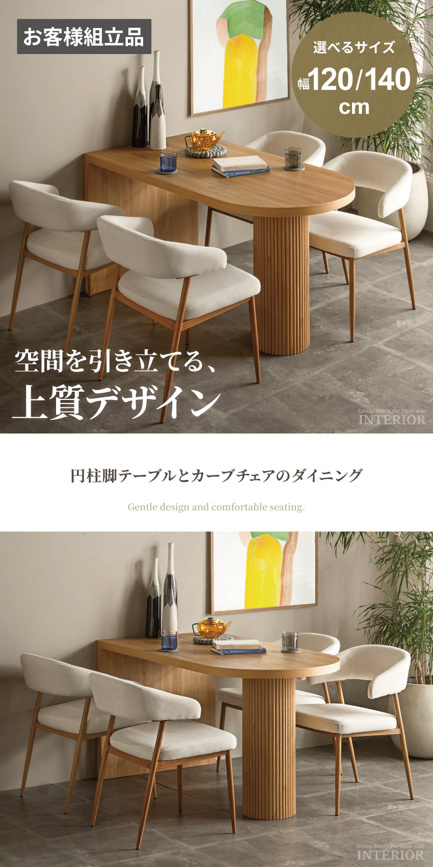 | ペニンシュラ型の天板と円柱の脚が特徴的なデザインのダイニングテーブル。片側を壁に付けてカウンタースタイルに、中央に置いてダイニングテーブルにも、レイアウト次第で印象が変わります。包み込まれるような背もたれデザインのチェア2脚はテーブルにぴったりなシンプルデザイン。ファブリック生地で季節問わず使用できます。120cm、140cm、チェア2脚をセットでも単品でもお好みでお選びいただけます。 | ||