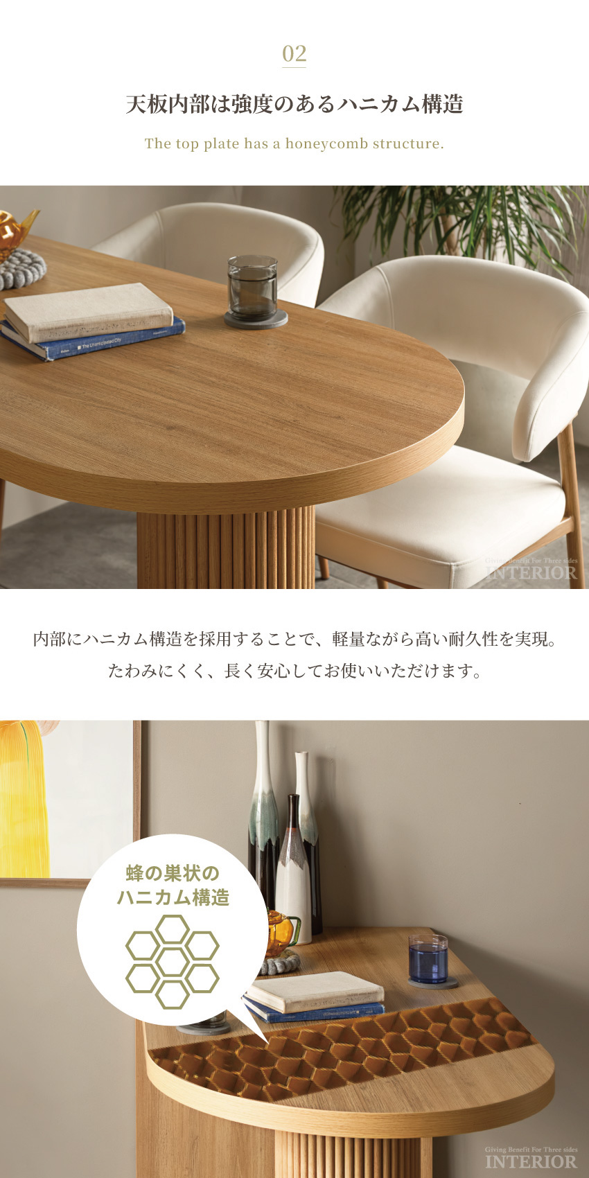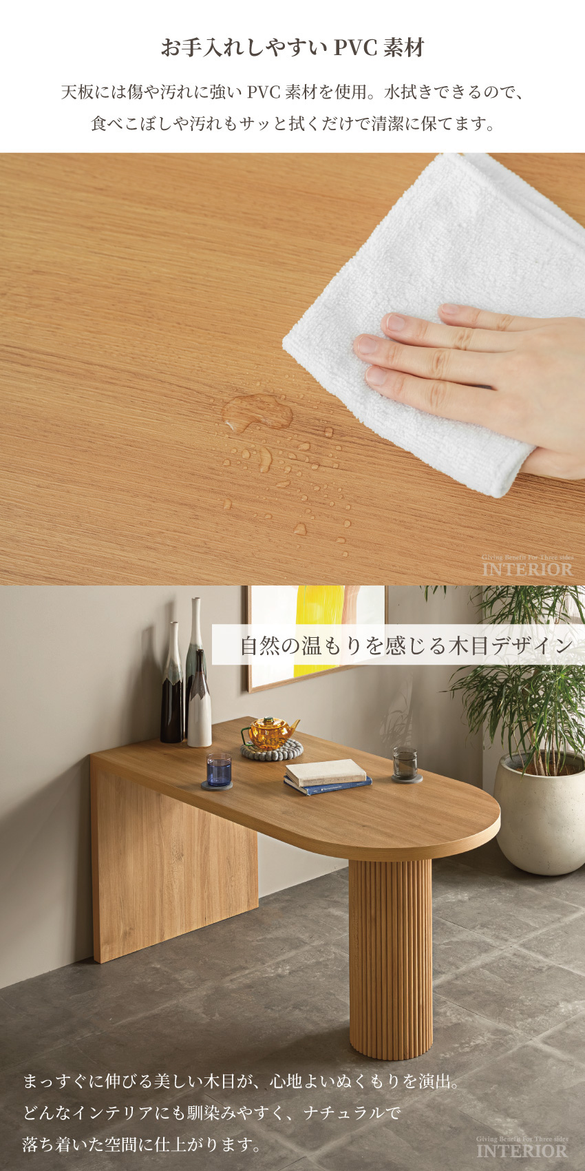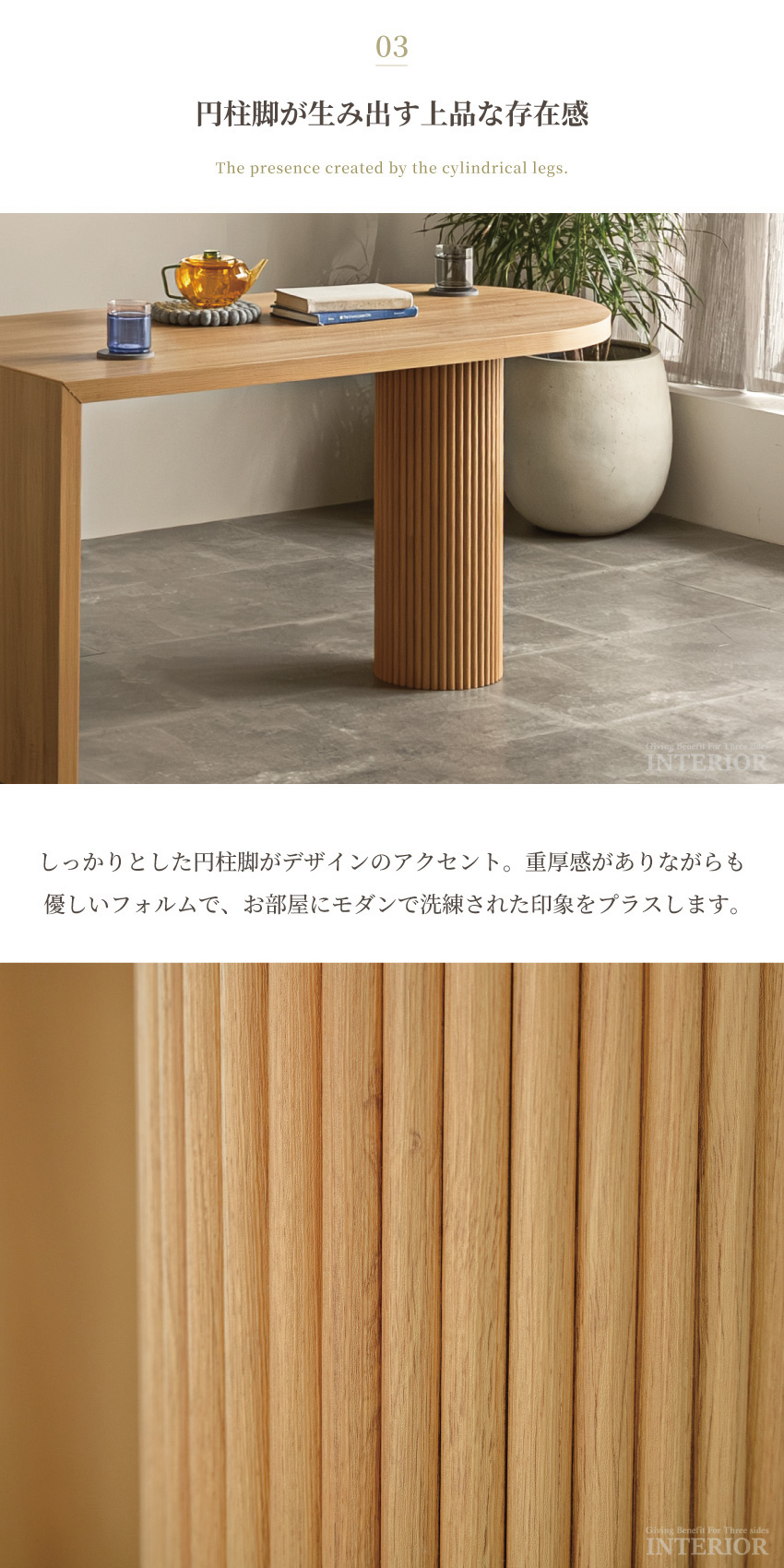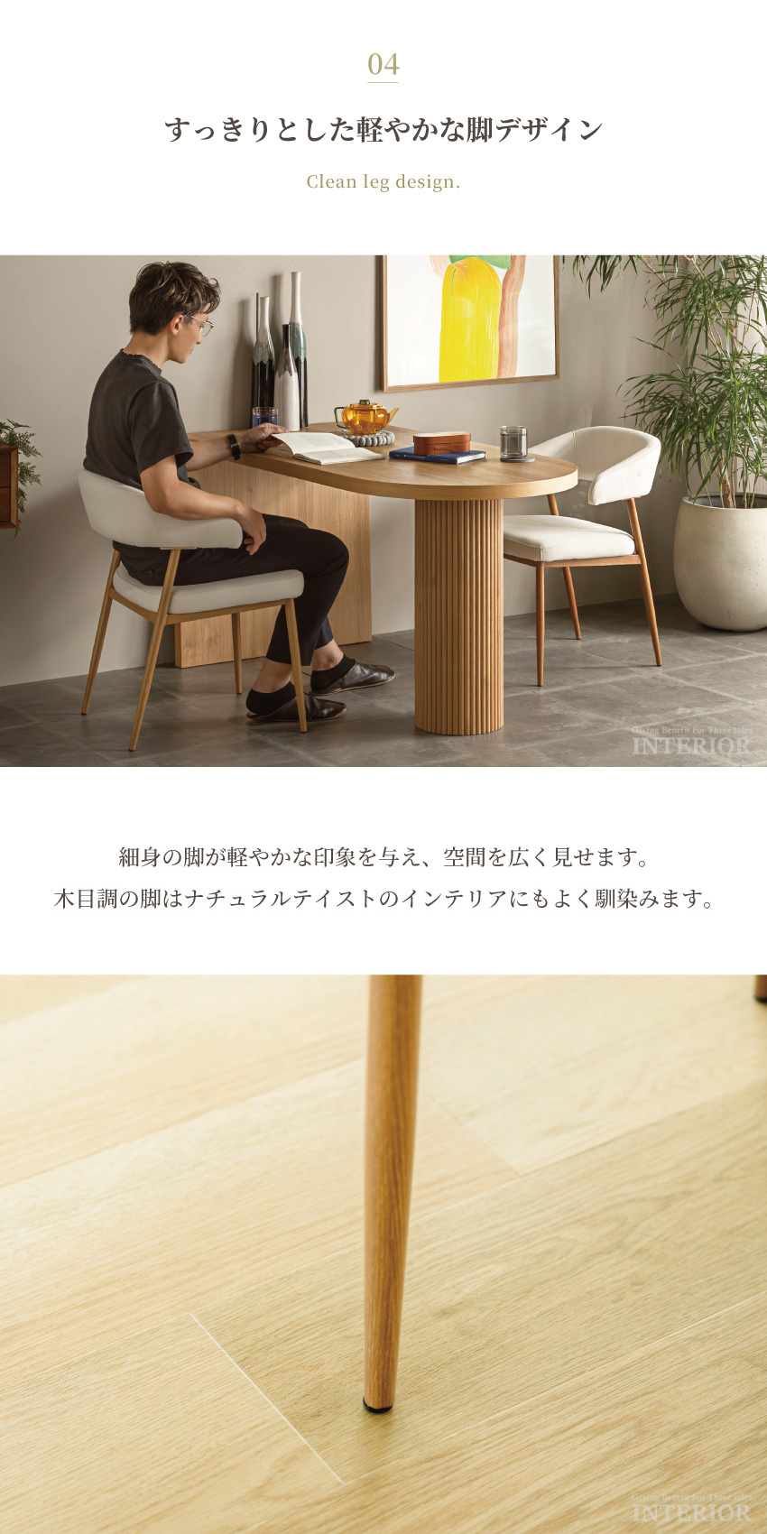 | ペニンシュラ型の天板と円柱の脚が特徴的なデザインのダイニングテーブル。片側を壁に付けてカウンタースタイルに、中央に置いてダイニングテーブルにも、レイアウト次第で印象が変わります。包み込まれるような背もたれデザインのチェア2脚はテーブルにぴったりなシンプルデザイン。ファブリック生地で季節問わず使用できます。120cm、140cm、チェア2脚をセットでも単品でもお好みでお選びいただけます。 | ||
